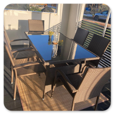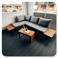 27 qm große überdachte Terrasse mit Lounge Garnitur und Esstisch, sowie 2 Liegen