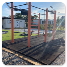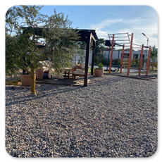 In unmittelbarer Nähe befindet sich der Kinderspielplatz mit Sandkasten und Trampolin, der bei den Kindern ebenso sehr beliebt ist.