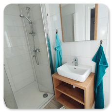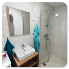 2 jeweils angrenzende Badezimmer mit großer Dusche und Föhn