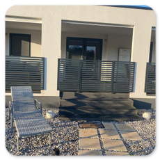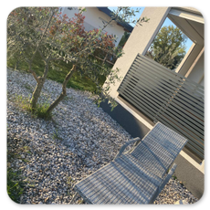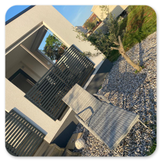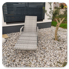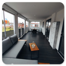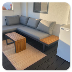 27 qm große überdachte Terrasse mit Lounge Garnitur und Esstisch, sowie 2 Liegen